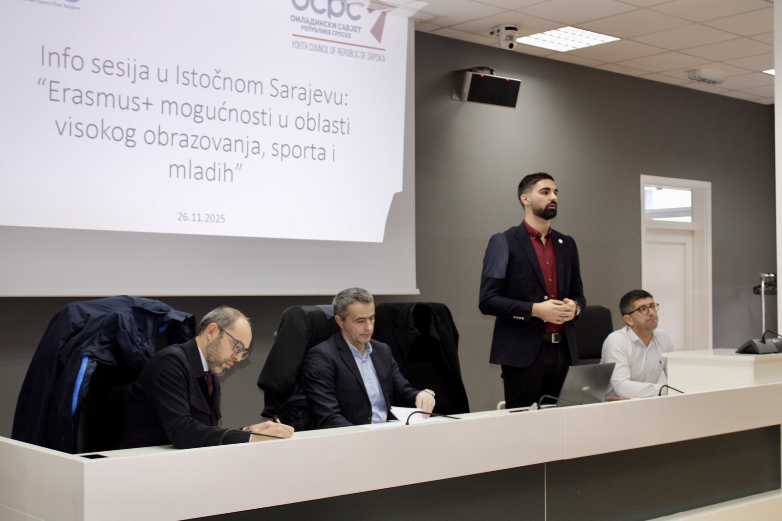 An Erasmus+ info session was held in East Sarajevo on 26 November 2025, organized by the National Erasmus+ Office in Bosnia and Herzegovina in cooperation with the Youth Council of Republika Srpska and the City Development Agency of East Sarajevo. The session aimed to present Erasmus+ opportunities available to BiH in the fields of youth and higher education, and to guide participants through the application and evaluation process.